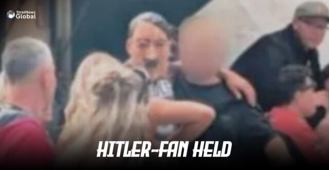 Wearing a rubber mask styled to resemble Hitler’s face, the man was seen drinking beer in full view of spectators during a racing event, apparently drawing laughter and attention from bystanders.