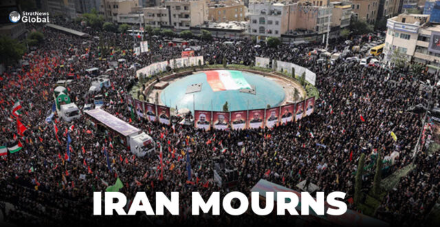 Their coffins were driven into Tehran’s Azadi Square adorned with their pictures as well as rose petals and flowers, as crowds waved Iranian flags. State-run Press TV showed an image of ballistic missiles on display.