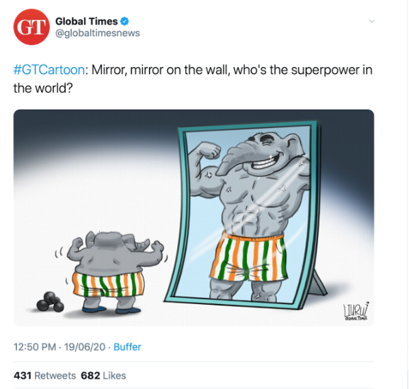 A Global Times cartoon titled “Mirror, mirror on the wall, who’s the superpower in the world?” showed an elephant in India’s tricolour admiring an exaggerated, muscular reflection. The message was unmistakable: mock India’s ambitions precisely when soldiers were dying on the border. The cartoon was later deleted following international backlash, illustrating both the bluntness of China’s messaging and its sensitivity when reputational costs rise. Similar visuals have surfaced since, particularly during border tensions or moments of closer India–U.S. alignment.