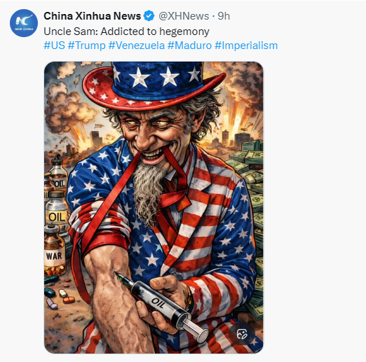 The most recent wave followed U.S. military action in Venezuela, after which Chinese state media circulated cartoons portraying Washington as a serial destabiliser of global order. Similar visuals have accompanied PLA exercises such as “Justice Mission 2025,” reinforcing Beijing’s preferred narrative about “external interference” and foreign-engineered instability.